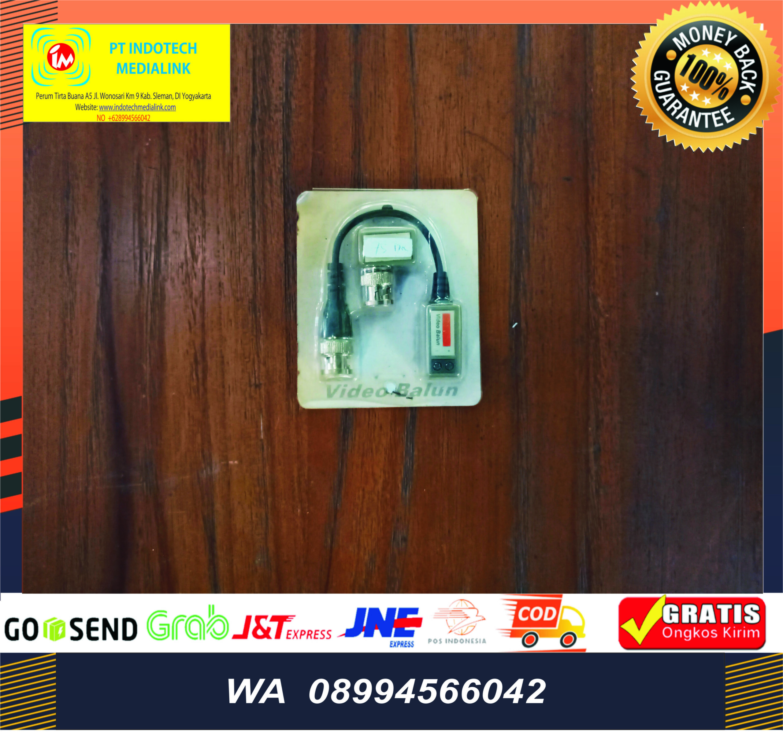 enguat video passive untuk CCTV ( dari camera ke DVR / TV ) tanpa perlu adaptor ya karna ini passive balun bukan yang aktif. Dengan menggunakan cctv 1 Channel Passive Video balun. Full-motion CCTV Video at distances up to 400 meter Straight Video Balun TANPA TAMBAHAN POWER ADApTOr ** Save lots of Extra Cable Money** Cukup pake kabel UTP CAT5e yg lebih ringkas lebih stabil gambarnya lebih jauh jaraknya, satu kabel beberapa kamera. Specifications – Maximum Output: 1.1Vp-p – Loss Ratio: >2dB – Rejection Ratio: – Transmission Distance: 400 meter – BNC Resistance: 75ohm – UTP Resistance: 100ohm Package Includes: 2 x CCTV BNC pigtail video balun via CAT5e cable